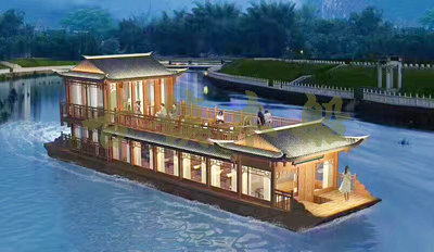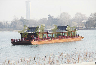 畫(huà)舫船就是裝飾古典華麗的游船,是"中國(guó)風(fēng)"的仿古游船,結(jié)合古典園林建筑,體現(xiàn)了中華文明的古典藝術(shù).畫(huà)舫船豪華而又古典,船上的建筑按照中國(guó)古代建筑里的亭臺(tái)樓閣,建筑工藝之復(fù)雜,要求之嚴(yán)格,仿古畫(huà)舫游船的特點(diǎn)飛檐翹角、玲瓏精致的四角亭子逐漸成形,赫然立于船頭,美人靠、盤(pán)龍柱子、彩畫(huà)……龍柱上的浮雕盤(pán)龍和祥云一層扣著一層,層層錯(cuò)落有致,雕刻精細(xì)到盤(pán)龍身上的每一個(gè)鱗片都細(xì)細(xì)可數(shù),古代皇家標(biāo)志性元素,在畫(huà)舫船上體現(xiàn)的淋漓盡致。除了雕刻、花窗,整條船還有一個(gè)看點(diǎn),那就是弧線(xiàn)優(yōu)美、高高翹起的船尾。游船并不大,長(zhǎng)約10米、寬3米,但是整體看起來(lái)堪稱(chēng)一件藝術(shù)品。船尾的雕花欄桿與船艙、船頭的雕刻遙相呼應(yīng),船身四周貼著浮雕祥云,給整條船增添了富貴、華麗的氣質(zhì)。
